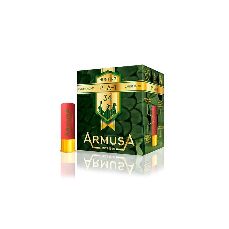 Cartouche Armusa Pla-1 calibre 12 de 34 grammes. Cartouche de chasse haute vélocité, spécialement conçue pour une pénétration maximale et une performance optimale sur le terrain. Fabriquée avec des matériaux de première qualité, cette munition utilise un plomb de 34 grammes de granulométrie 8, idéal pour la chasse au petit et moyen gibier. Le culot est calibré à 16 mm, assurant une excellente étanchéité et une combustion uniforme de la poudre, tandis que la douille de 70 mm garantit une charge propulsive stable et constante.
